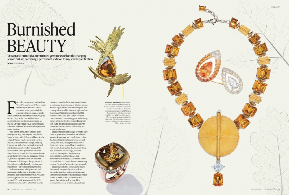 Our resident jewellery expert, Avril Groom, shines a light on the evolution and enduring appeal of coloured gemstones. Warm, golden yellows, autumn-toned stones, and vintage wine shades have long adorned the collections of the biggest names in luxury design, showcasing the appetite for gem fireworks.
