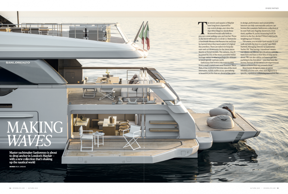 Moving from trains to yachts, master yacht maker and one of this issue’s partners, Sanlorenzo, has set Mayfair as its next destination as it opens its smart new HQ in London. At the flagship store on Park Lane, you’ll be able to design your perfect bespoke model and work with the creators of some of the most beautiful vessels on the seas.